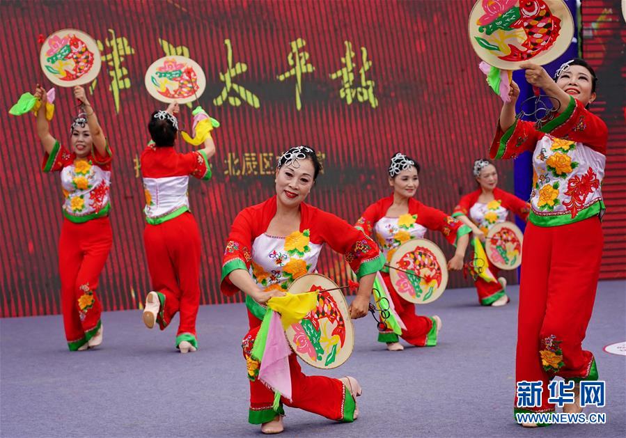 6月26日,天津市北辰区文化馆飞天舞蹈队的演员在表演《津门太平鼓》。当日,由京津冀三省市非物质文化遗产保护中心联合主办的“京津冀特色非物质文化遗产项目展示展演”在河北省秦皇岛市抚宁区开幕。此活动为期两天,将有来自京津冀地区的19支队伍共300余名演员为观众献上传统非遗表演。新华社记者 杨世尧 摄