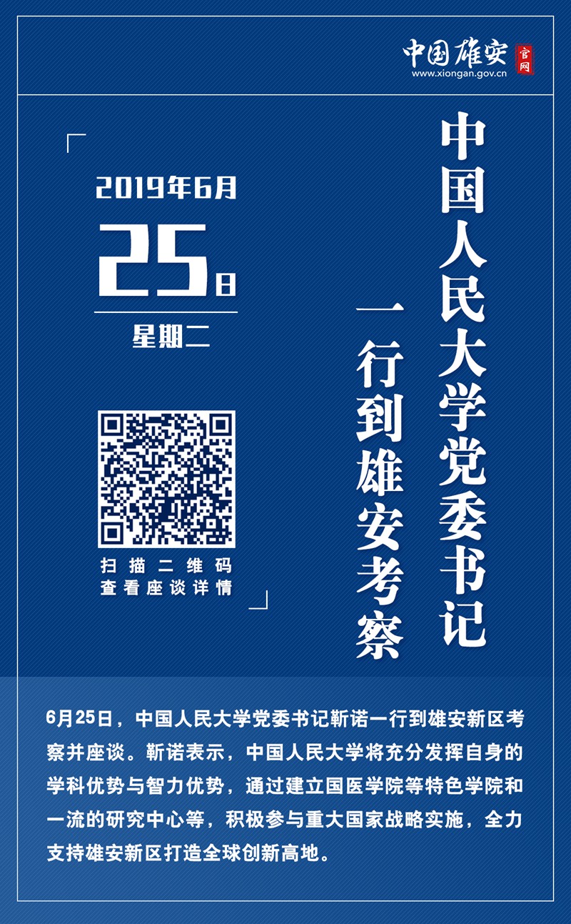 6月25日,中国人民大学党委书记靳诺一行到雄安新区考察,深入了解雄安新区整体规划及建设情况并进行交流座谈。