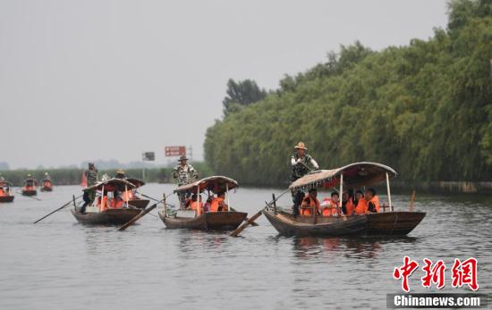 6月26日,多名游客在白洋淀乘船游湖。7月1日起,河北省保定市制定出台的《保定市白洋淀上游生态环境保护条例》将实施,在白洋淀上游生态系统保护上建立长效机制,助力雄安新区生态建设。中新社记者 王刚 摄