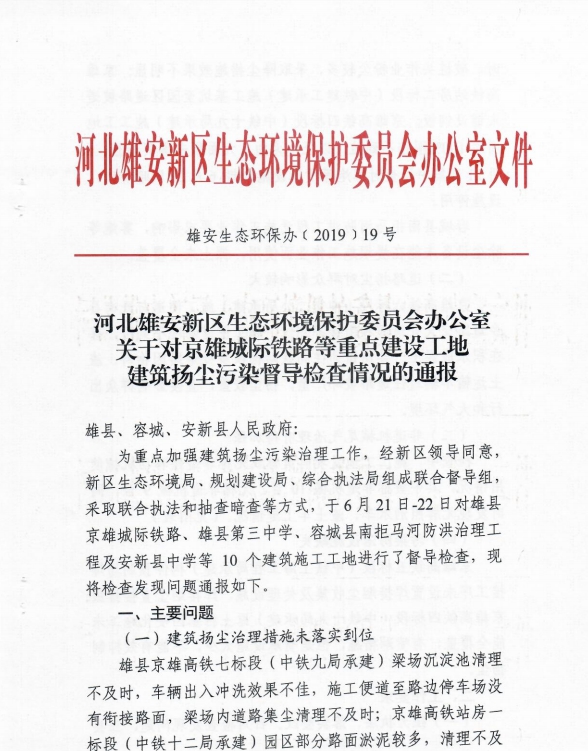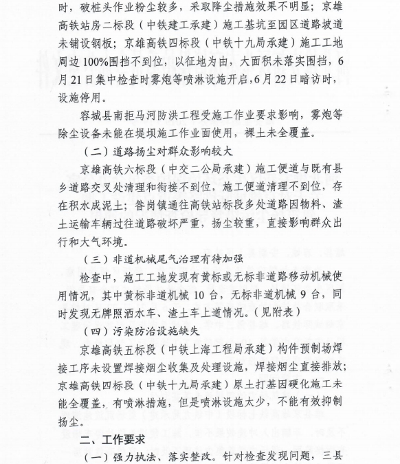 雄安新区生态环境局相关负责人介绍,此次督导检查大部分问题集中在京雄城际铁路各施工标段。其中,中铁上海局在5标段工程建设过程中,构件预制场焊接工序未设置焊接烟尘收集及处理设施,焊接烟尘直接排放;4标段建设单位中铁十九局在6月21日集中检查时,雾炮等喷淋设施开启,但是在次日执法人员再次暗访时,喷淋设施却已停用。