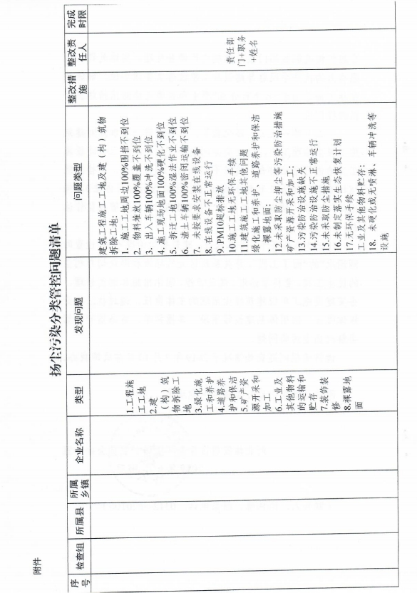 经过两天的仔细检查,3个检查组在该10个建筑施工工地上共发现各类扬尘污染问题20个,问题主要集中在“建筑扬尘治理措施未落实到位”“道路扬尘对群众影响较大”“非道机械尾气治理有待加强”“污染防治设施缺失”等方面。