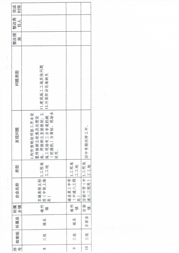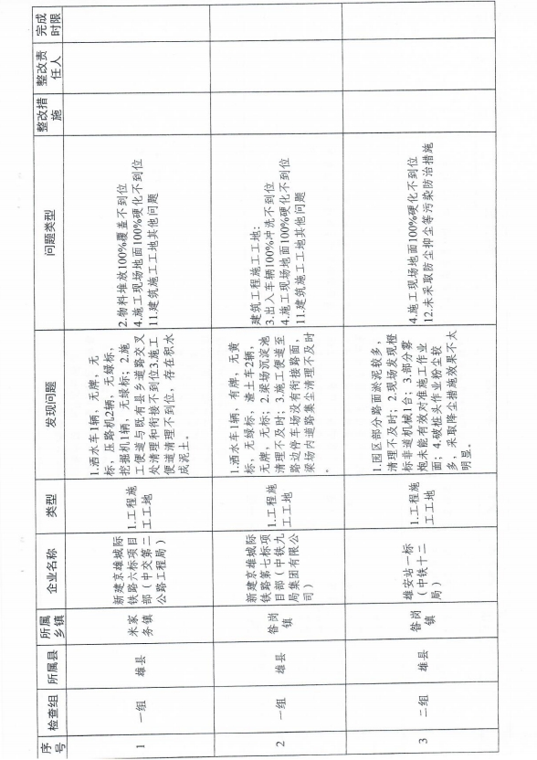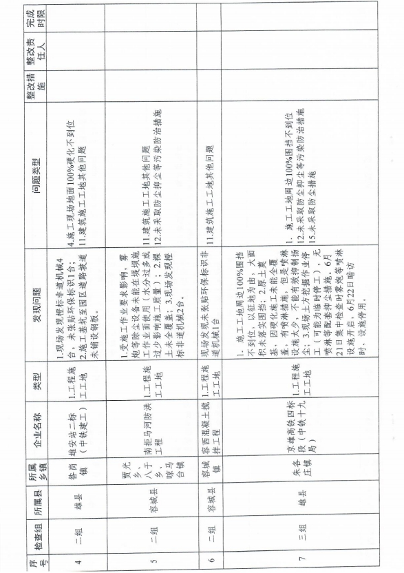 检查发现,安新县安新中学项目因中考管控未进行施工;雄县第三中学项目接近工期尾声且措施到位,未发现问题;容城县南拒马河防洪治理工程和混凝土搅拌站有少量问题。