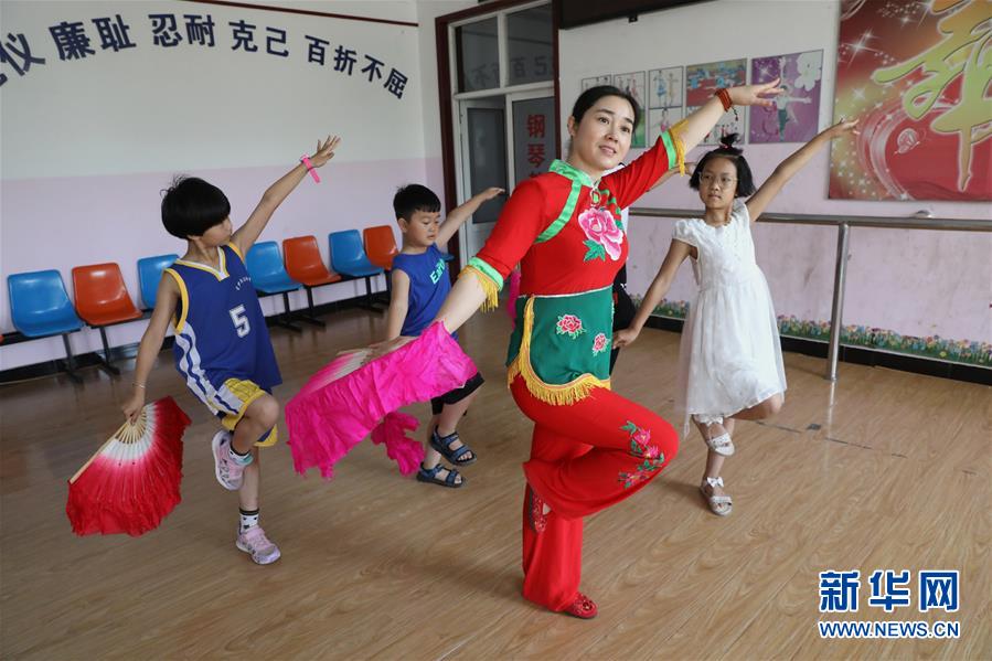 7月3日,在晋州市青少年活动中心,晋州官伞第五代代表性传承人张月肖为孩子们示范舞蹈动作。新华社发(梁子栋 摄)