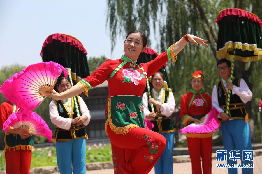 7月3日,在晋州市魏征公园,晋州官伞第五代代表性传承人张月肖(前)在演示舞蹈动作。新华社发(梁子栋 摄)