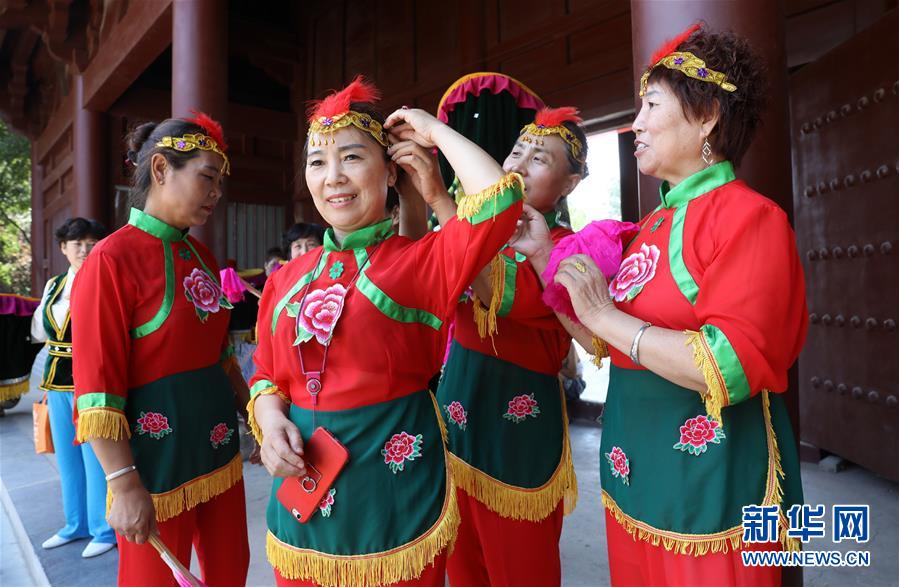 7月3日,在晋州市魏征公园,晋州官伞爱好者在排练之前做准备。新华社发(梁子栋 摄)