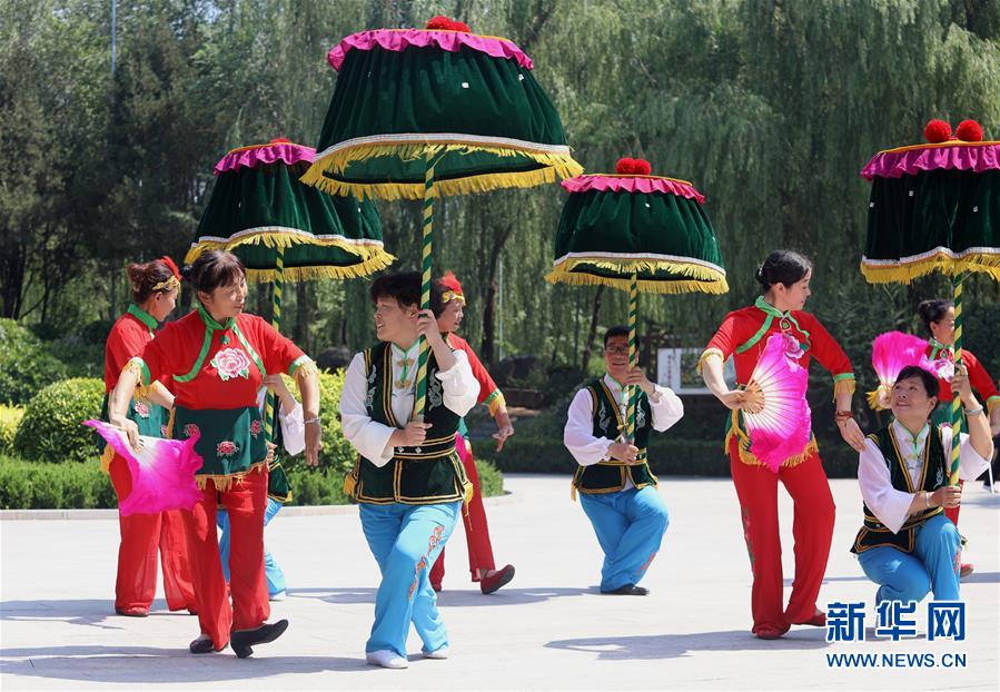 7月3日,在晋州市魏征公园,晋州官伞爱好者在排练。新华社发(梁子栋 摄)