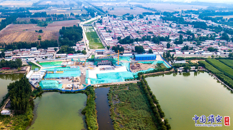 雄安新区设立后,为恢复白洋淀“华北之肾”的功能,构建新区“蓝绿交织、清新明亮、水城共融”的生态布局,新区要求将白洋淀生态水位提高至6.5m~7.0m,原有设计条件无法自流入淀,为此需要在引黄入冀补淀工程末端入淀口处新建扬水泵站,即白洋淀引黄大树刘泵站工程,确保黄河水在较高水位条件下也能顺利入淀,有效维持淀区生态水位。图为航拍白洋淀引黄大树刘泵站工程现场。中国雄安官网记者马梦迪 摄
