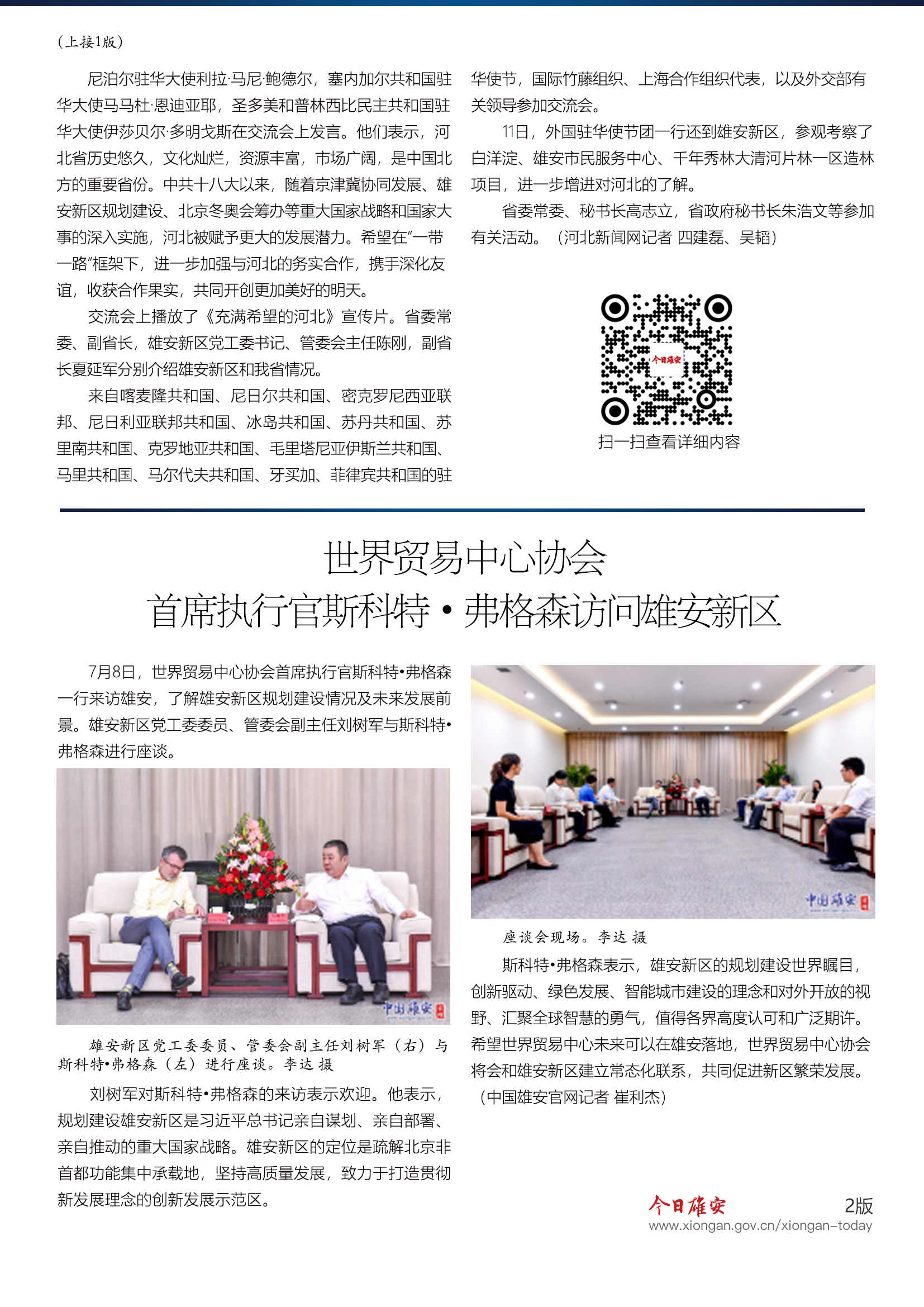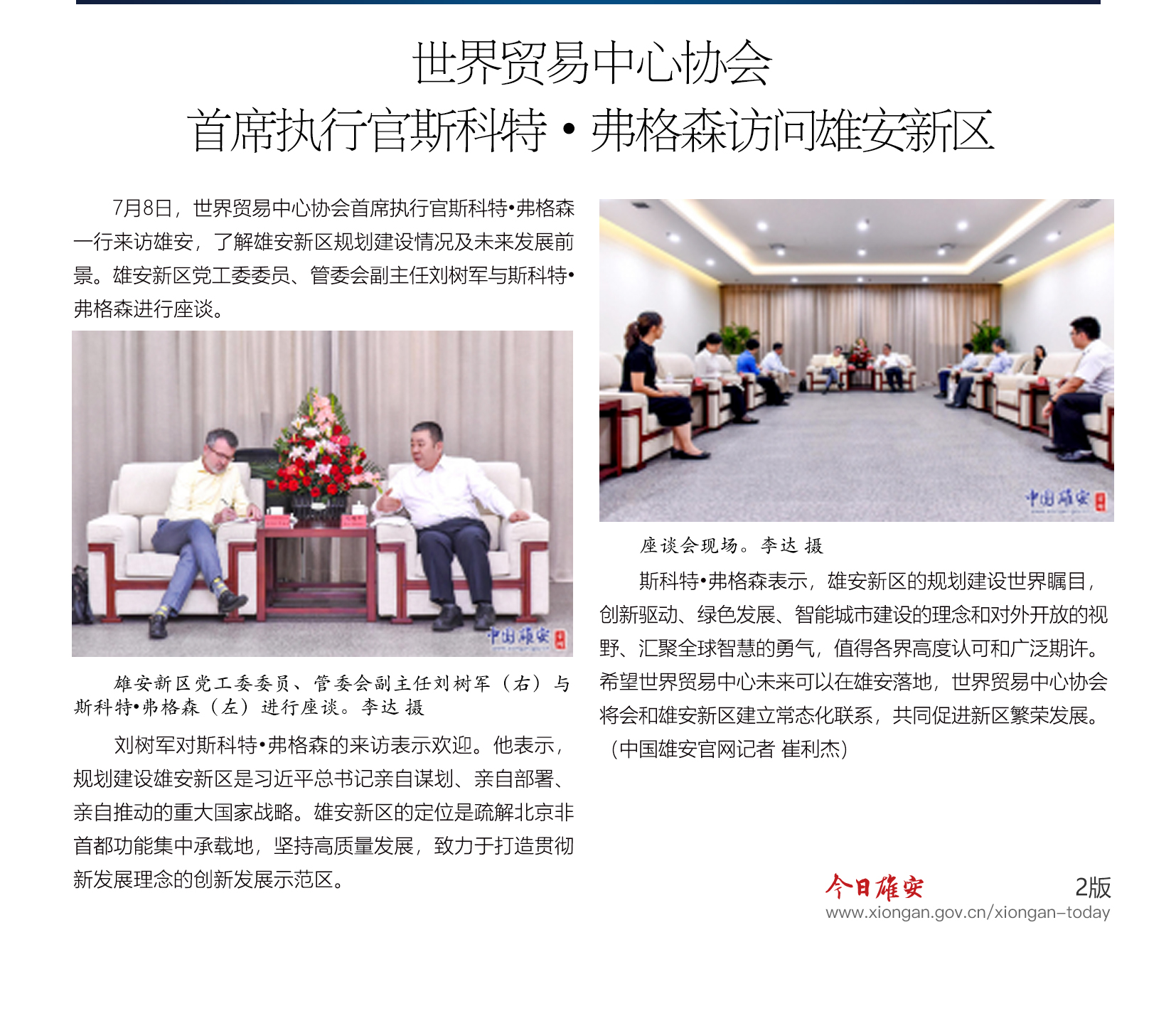 7月8日,世界贸易中心协会首席执行官斯科特•弗格森一行来访雄安,了解雄安新区规划建设情况及未来发展前景。