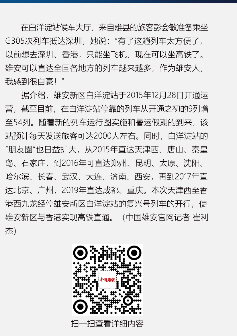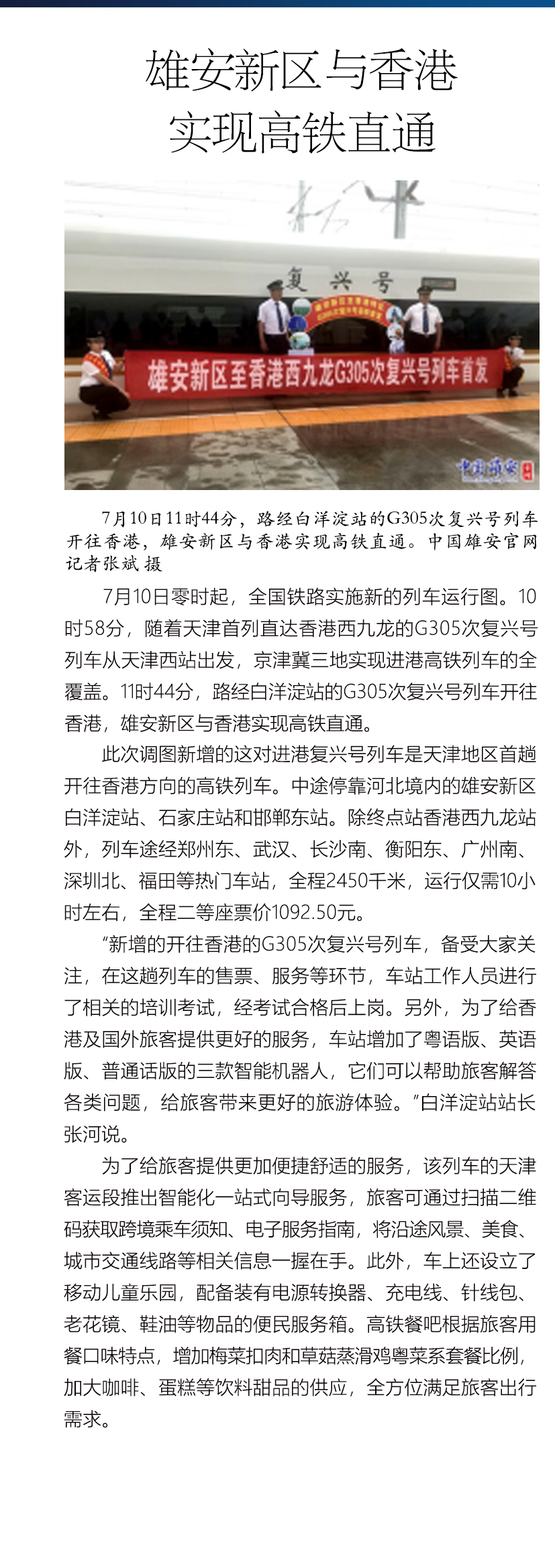 天津首列直达香港西九龙的G305次复兴号列车从天津西站出发,京津冀三地实现了进港高铁列车的全覆盖,雄安新区的旅客也可乘坐该趟高铁直通香港。