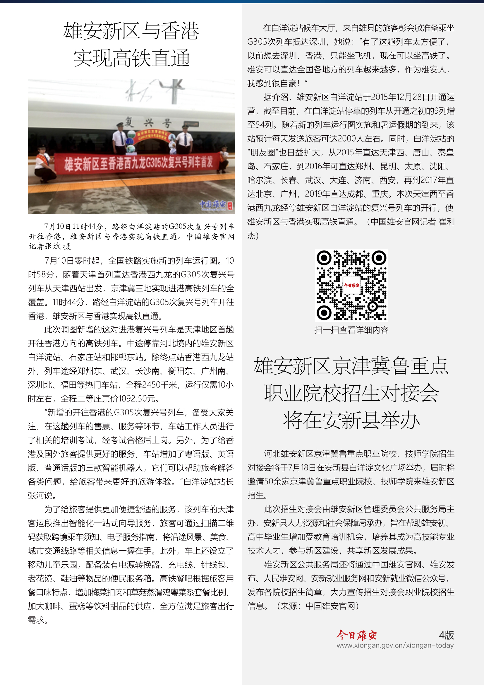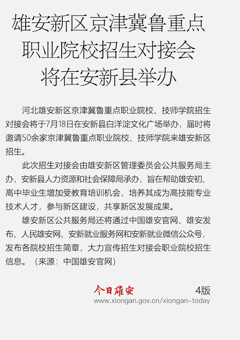 7月18日,河北雄安新区京津冀鲁重点职业院校、技师学院招生对接会将在安新县白洋淀文化广场举办。