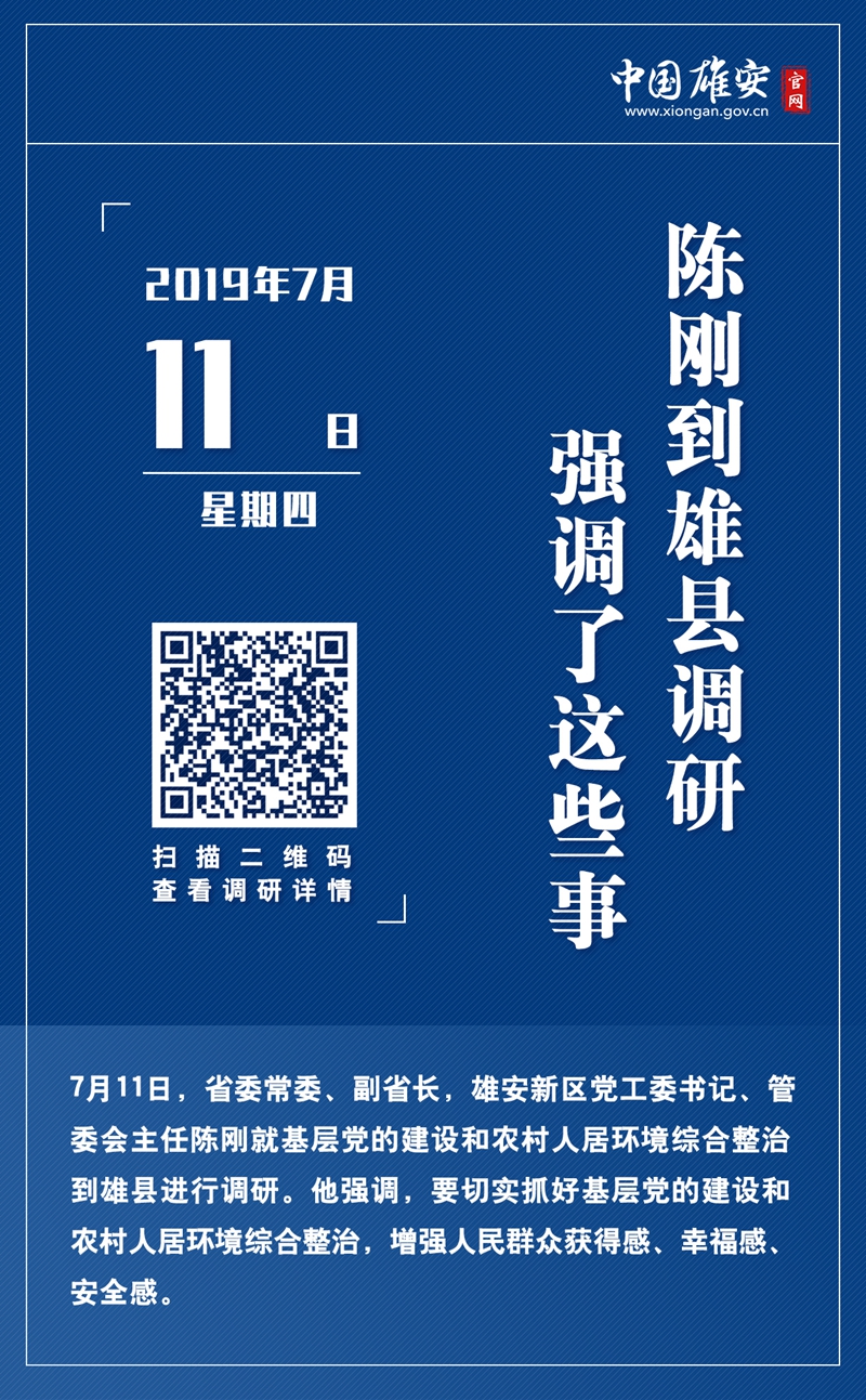 7月11日,省委常委、副省长,雄安新区党工委书记、管委会主任陈刚就基层党的建设和农村人居环境综合整治到雄县进行调研。
