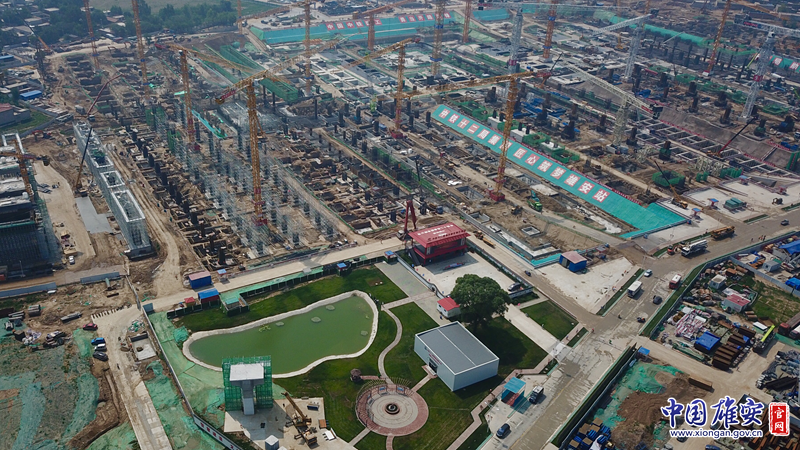 左下角为京雄城际铁路雄安站房一标段施工现场的小公园。中国雄安官网记者张斌 摄