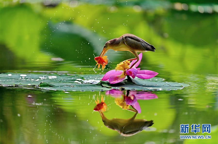 7月15日,一只水鸟在唐山市南湖公园的荷塘抓鱼。 近日,大批水鸟飞临河北省唐山市南湖公园,在荷花绽放的湖面上飞舞嬉戏,形成一道靓丽的风景线。唐山市南湖公园所在地曾是因采煤沉降而形成的废弃地,污水横流。1996年起,唐山市开始对南湖采煤沉降地进行综合治理。经过不懈努力,这里已变身为一处水域面积11.5平方公里、绿地面积16平方公里的风景区。新华社记者杨世尧摄