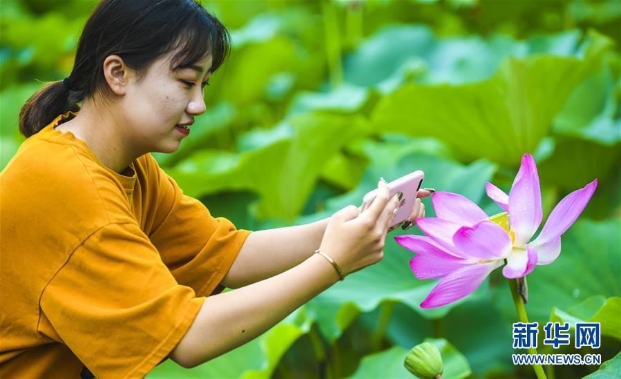 7月17日,游客在河北省大厂回族自治县陈府紫图生态庄园观赏荷花。河北省大厂回族自治县依托毗邻北京的区位优势,推进全域旅游发展,打造乡村旅游品牌,助力乡村振兴。时值夏日,该县陈府紫图生态庄园荷塘景区的荷花竞相绽放,吸引众多游人前来观光游览。新华社记者 李晓果 摄