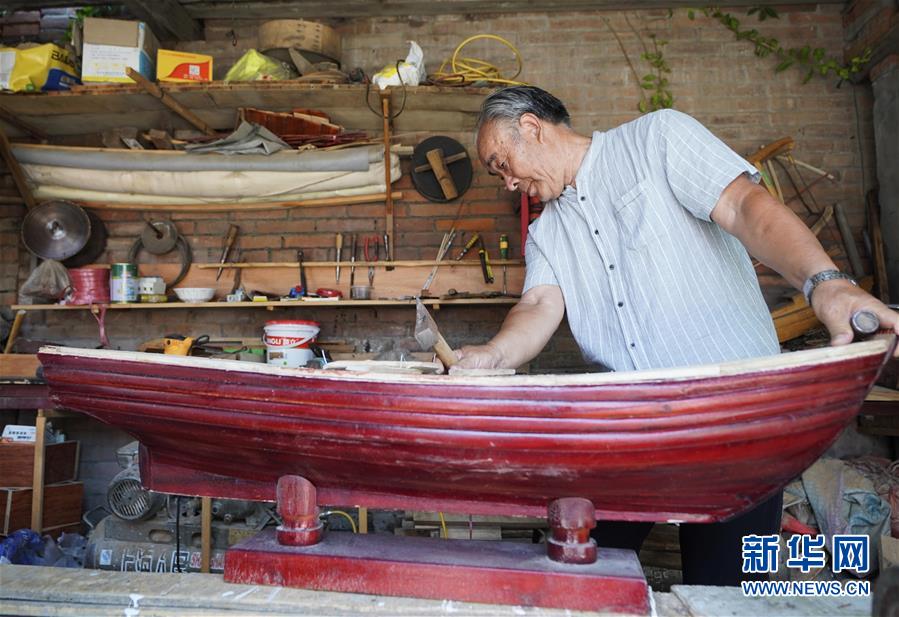 7月25日,刘广玉在制作木船模型。今年68岁的刘广玉是河北雄安新区安新县马家寨村人,马家寨村是北方地区有名的造船专业村。刘广玉自幼喜欢摆弄木头,擅长木板画。他目前制作了21款白洋淀历史上出现过的木船模型,用手工打造白洋淀记忆。新华社记者 邢广利 摄