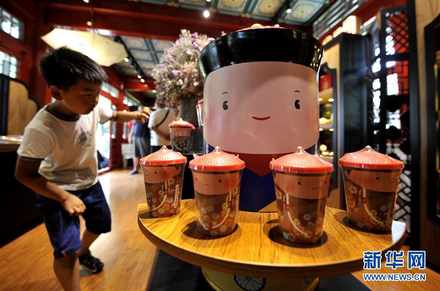 7月26日,一名小游客在承德避暑山庄选购特色茶饮品。 近年来,河北承德避暑山庄加大文创产品的研发力度,深度挖掘“皇家”元素,研发兼具山庄文化与时代特点的文创产品,受到游客青睐。新华社记者 王晓 摄