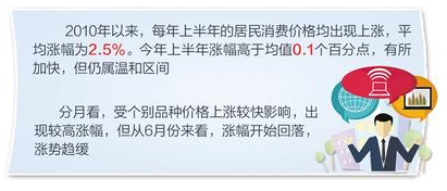 国家统计局河北调查总队副总队长许春伟表示,2010年以来,每年上半年的居民消费价格均出现上涨,平均涨幅为2.5%。今年上半年涨幅高于均值0.1个百分点,有所加快,但仍属温和区间。分月看,受个别品种价格上涨较快影响,出现较高涨幅,但从6月份来看,涨幅开始回落,涨势趋缓。