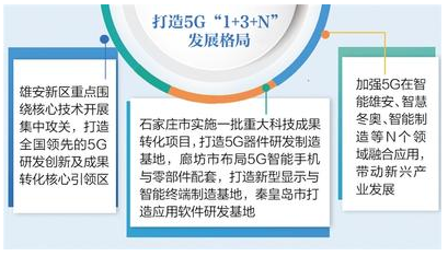 为加快我省5G产业发展和商用步伐,提升对河北省数字经济支撑作用,推动转型升级和高质量发展,近日,河北省政府办公厅印发《关于加快5G发展的意见》。指出以安全高效便捷的5G网络建设为基础,以5G产业创新发展为核心,以5G融合应用为切入点,打造5G“1+3+N”发展格局。即雄安新区重点围绕核心技术开展集中攻关,打造全国领先的5G研发创新及成果转化核心引领区;石家庄市实施一批重大科技成果转化项目,打造5G器件研发制造基地,廊坊市布局5G智能手机与零部件配套,打造新型显示与智能终端制造基地,秦皇岛市打造应用软件研发基地;加强5G在智能雄安、智慧冬奥、智能制造等N个领域融合应用,带动新兴产业发展。