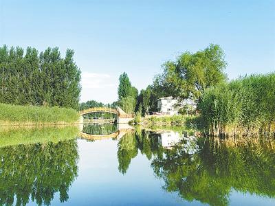 近水楼台,靠水吃水,在村委会的倡导下,许多家庭办起了农家院,游人可以通过互联网实现网上预约。村东毗邻的八达淀,水面开阔,约有四五百亩,因村规民约规范,环境治理到位,偌大的水面清澈见底,能看到游动的鱼虾,不见一点垃圾和杂物。沿临村堤岸,铺设了一米多宽的木栈道,蜿蜒数百米,其中近村木栈道上建有廊庑,类似南方的风雨桥,为村民休憩遮蔽风雨日晒,廊檐上悬挂着彩灯,10米高的大水车,不知疲倦地悠悠转动,再往前20余米的水中泊着一条大木船,有游人在船上凭栏拍照。木栈道沿堤岸向东村外延伸,堤岸上两行毛白杨高大挺拔,其叶蓁蓁,树干根部被栈道木板镶嵌其中,即使酷暑,走在蓬勃的树荫下,顿觉凉风习习。落日熔金,晚霞仿佛烧红的钢铁在天空流淌,水鸟在空中盘旋,正是“落霞与孤鹜齐飞,秋水共长天一色”。此时廊上华灯初上,霓虹灯和着天边的云霞倒映水中。风乍起,吹皱了一池碧水。远处的一抹抹芦花在风中摇曳,堤上树影婆娑。置身其间,避之喧嚣,回归内心世界的纯净,夫复何求!