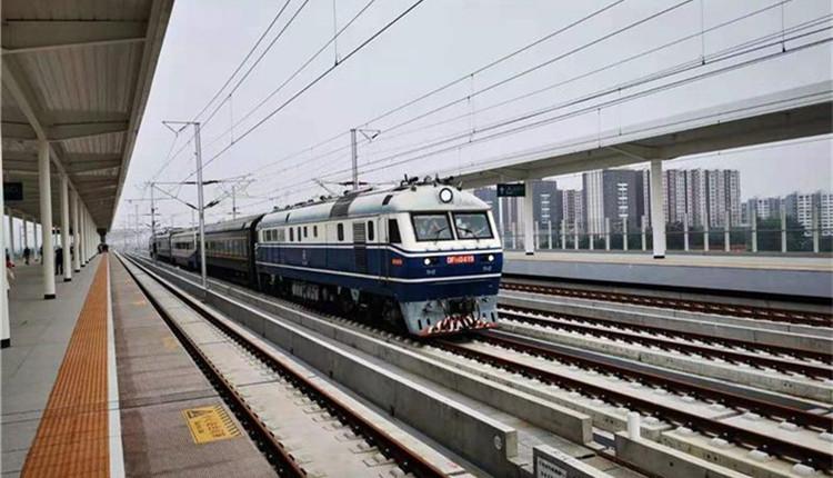 8月9日9时20分,首列京雄城际联调联试列车停靠在北京大兴站站台内,这是联调联试列车组,包括车头、隔离车、轨道检查车、试验车、车头等五节检测车。