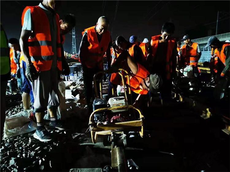 8月8日23时30分,在京九线李营站4号、22号道岔旁,600名施工工人,经过250分钟,道岔铁轨移动119米,精度误差1毫米以内,完成了京雄城际接入京九线普速。(记者耿辉 通讯员李溢春、朱啸龙摄影报道)