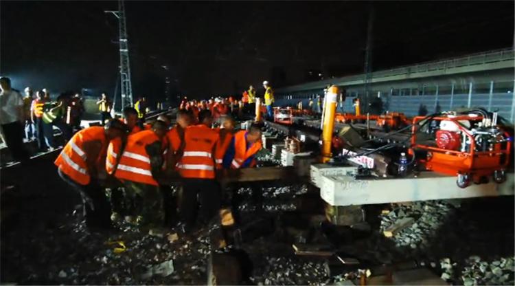 8月8日23时30分,在京九线李营站4号、22号道岔旁,600名施工工人,经过250分钟,道岔铁轨移动119米,精度误差1毫米以内,完成了京雄城际接入京九线普速。