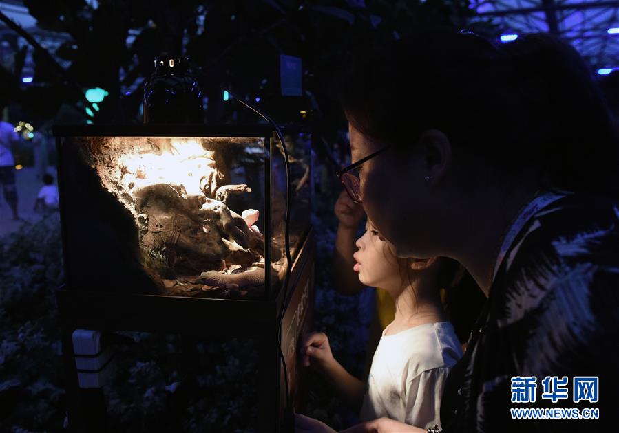 8月10日,游客在“会发光的植物园——小动物奇妙夜”活动中参观。 7月5日至10月7日,“会发光的植物园——小动物奇妙夜”在北京南宫世界地热博览园五洲植物乐园举行。 据了解,本次活动共展出7个品类上百只小昆虫和14个品种40多只夜行动物,游客在游览的同时,还可以欣赏到小动物表演、荧光舞等。新华社发(任超摄)