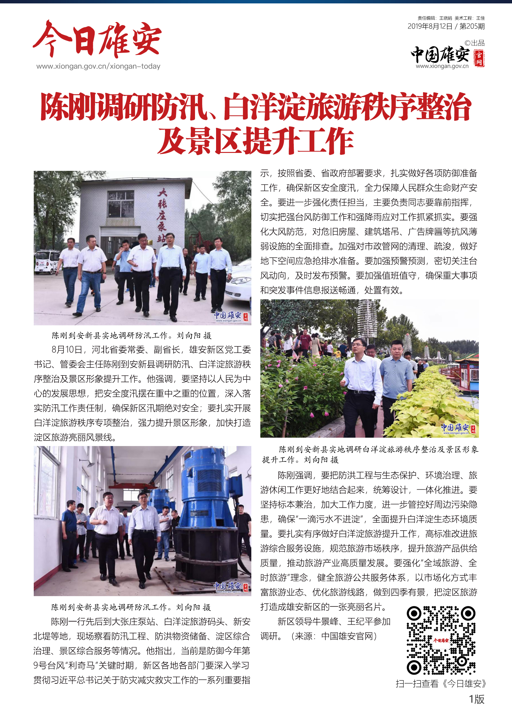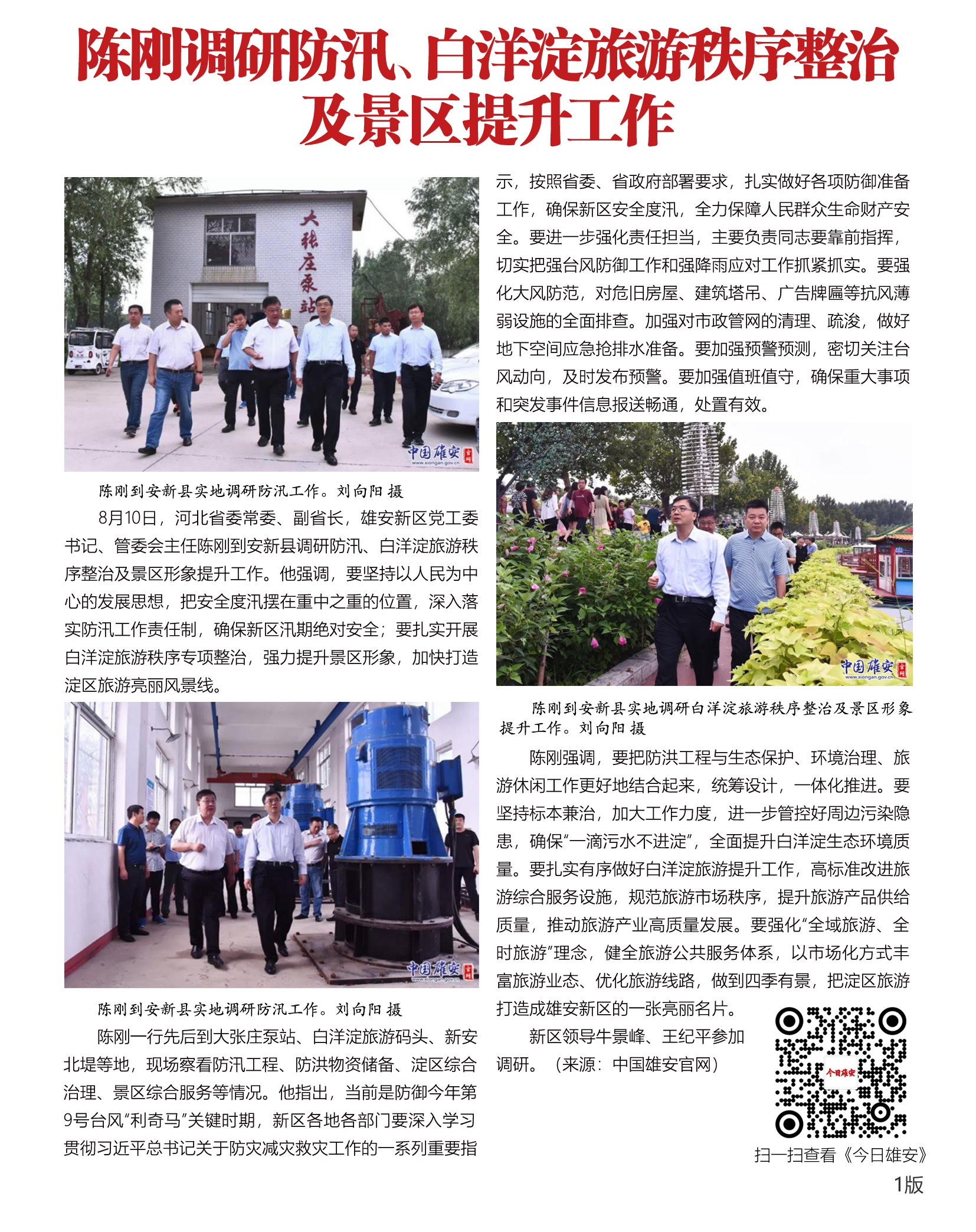 8月10日,陈刚到安新县调研防汛、白洋淀旅游秩序整治及景区形象提升工作。