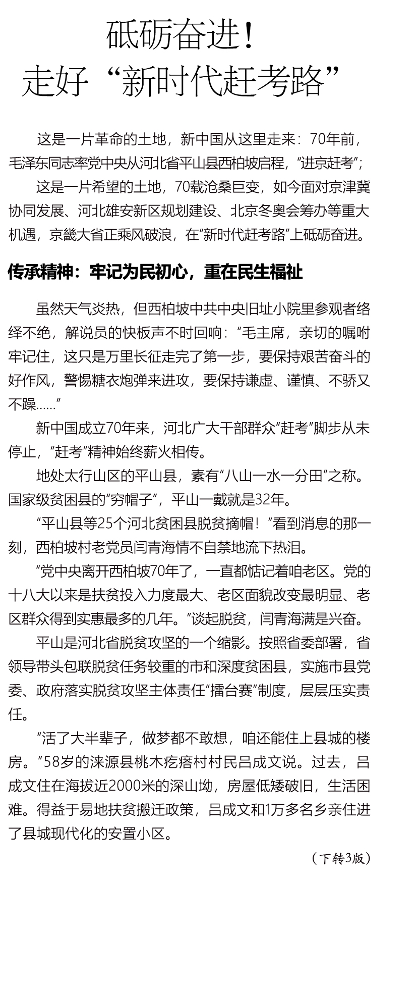 新中国成立70年来,河北广大干部群众“赶考”脚步从未停止,“赶考”精神始终薪火相传。