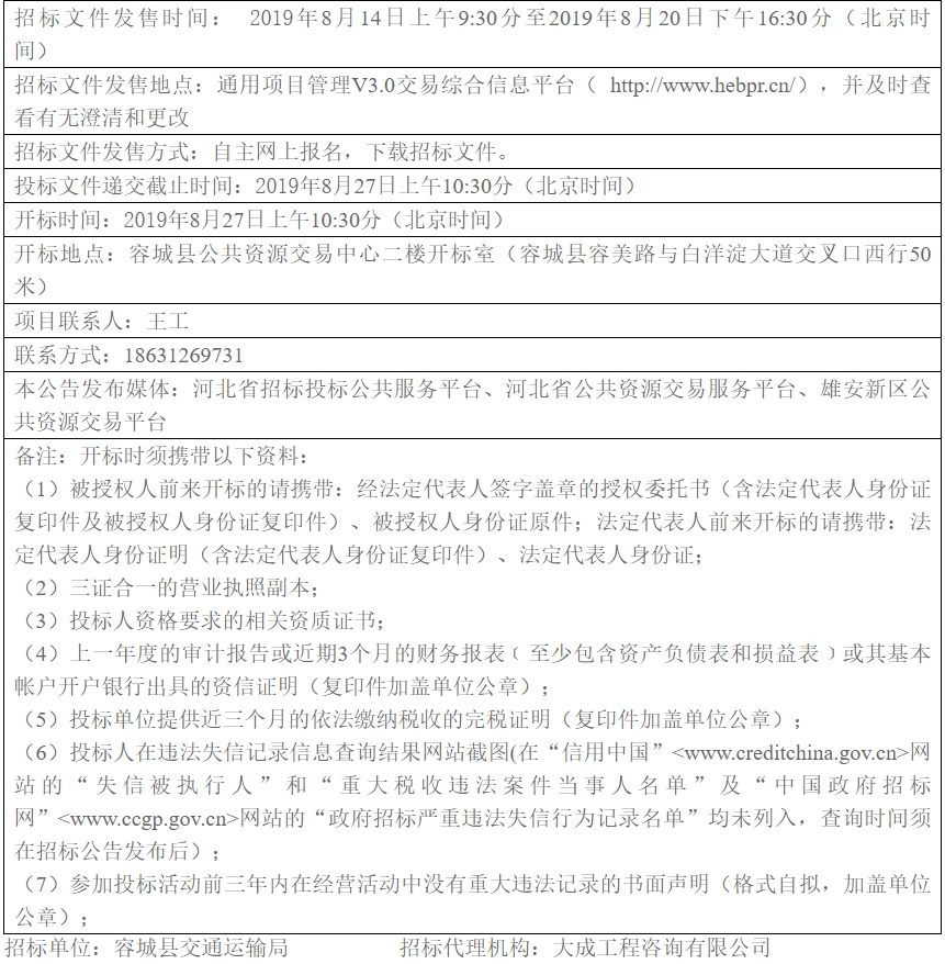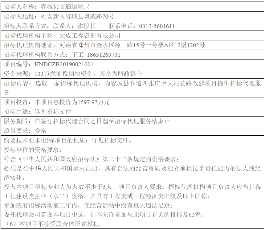 雄安招标丨容城县乡道西张庄至大河公路改建项目公开竞争选取代理机构招标公告