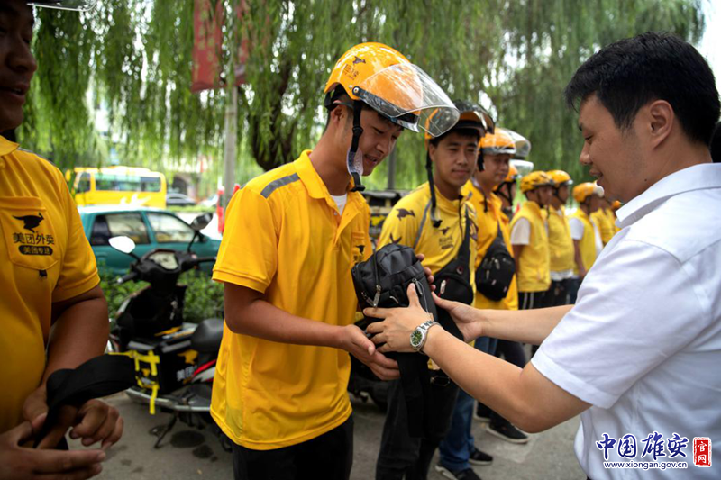雄安新区党群工作部有关负责人将礼包送到外卖骑手的手中。中国雄安官网贾楠 摄