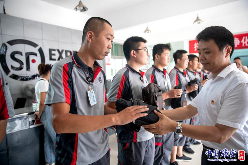雄安新区党群工作部有关负责人将礼包送到快递小哥的手中。中国雄安官网贾楠 摄
