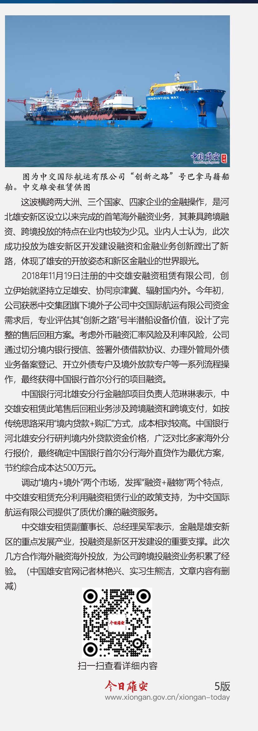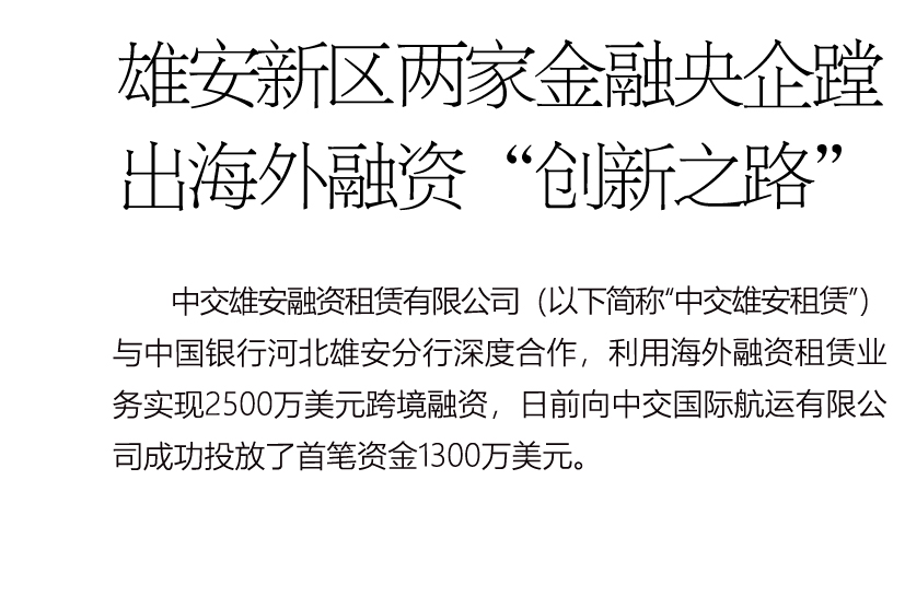 中交雄安融资租赁有限公司与中国银行河北雄安分行深度合作,利用海外融资租赁业务实现2500万美元跨境融资。