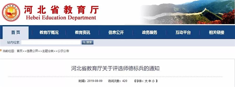 近日,河北省教育厅发布《关于评选师德标兵的通知》。据悉,河北省决定在全省开展2019年度师德标兵评选活动,共计评选400名河北省师德标兵,其中中小学幼儿园300名,普通高等学校100名,赶紧一起了解↓↓↓