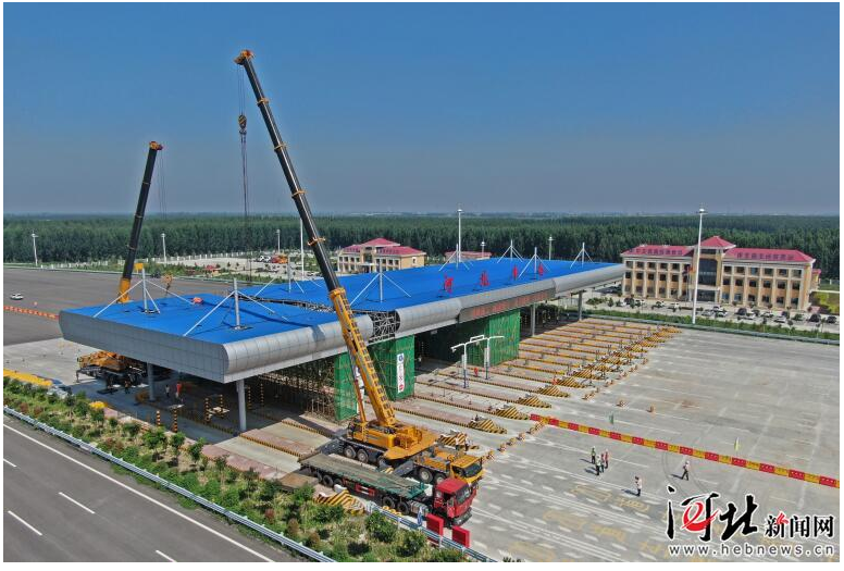 8月15日上午,唐廊高速冀津界丰南主线收费站开始拆除改造,工人正在做将左侧五个车道的金属顶棚吊起的准备工作。