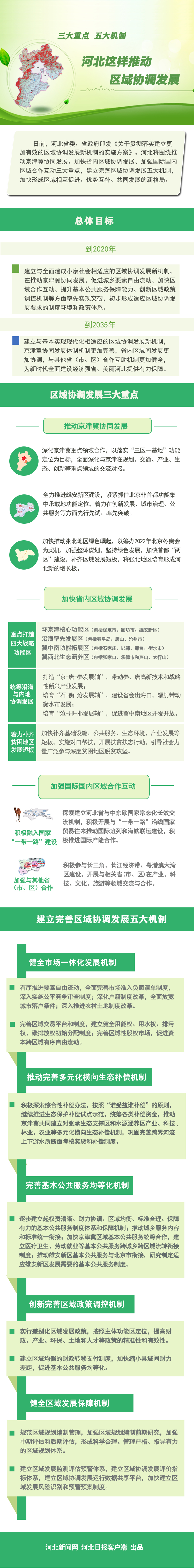 日前,河北省委、省政府印发《关于贯彻落实建立更加有效的区域协调发展新机制的实施方案》。河北将围绕推动京津冀协同发展、加快省内区域协调发展、加强国际国内区域合作互动三大重点,建立完善区域协调发展五大机制,加快形成区域相互促进、优势互补、共同发展的新格局。