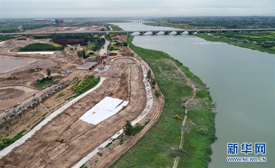 8月13日,工人在石家庄市滹沱河北岸城市公园建设工地施工(无人机拍摄)。