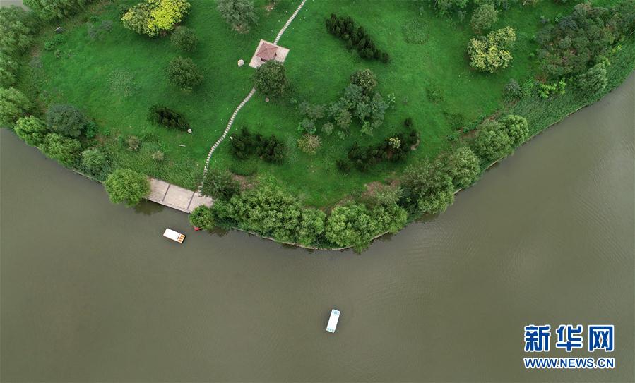 8月13日,游客在石家庄市滹沱河景区荡舟观光(无人机拍摄)。
