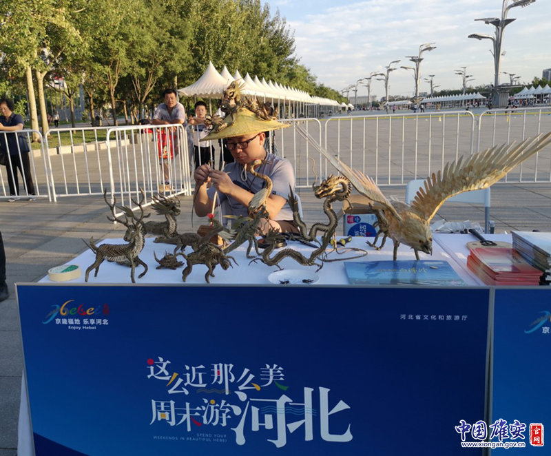 活动现场,雄安新区公共服务局推出的鄚州草编和京簧竹刻非遗项目亮相“这么近,那么美,周末游河北”主题宣传活动,非遗传承人还进行了现场表演,吸引众多游客驻足欣赏。