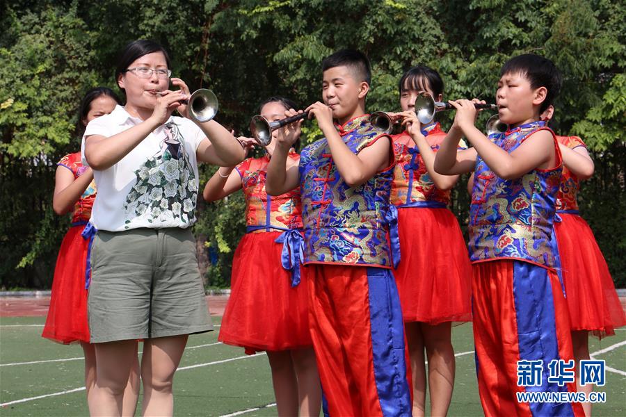 8月18日,邯郸市永年区第五实验学校的老师在带领学生吹奏唢呐。 近年来,河北省邯郸市永年区教育部门把开展乡土文化教育作为创新和深化未成年人思想道德和身心健康建设的重要途径,在暑假期间组织开展唢呐、戏曲、武术等乡土特色公益课堂,让孩子们在推进素质教育的过程中快乐度暑假。新华社记者 牟宇 摄