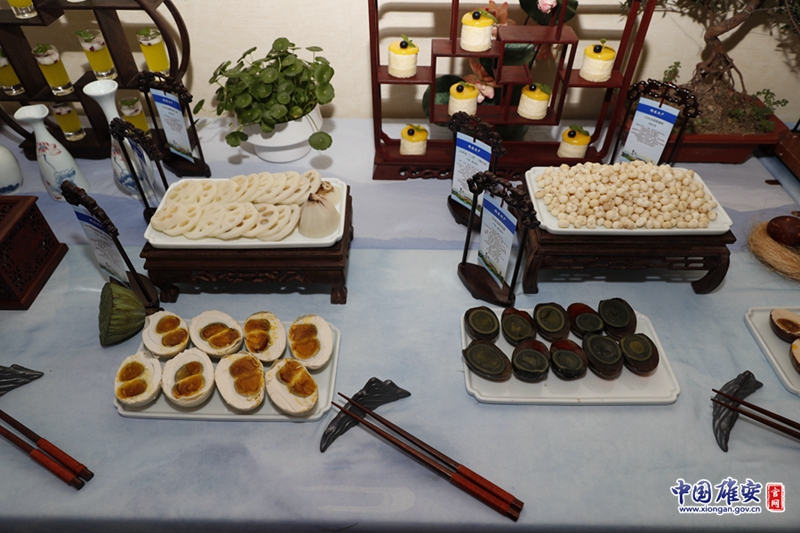 茶歇区,中式茶歇展架与雄安特色工艺品融合,搭配白洋淀咸鸭蛋、白洋淀莲藕等雄安特色美食,尽显雄安地域风情。中国雄安官网记者毛鹤然 摄