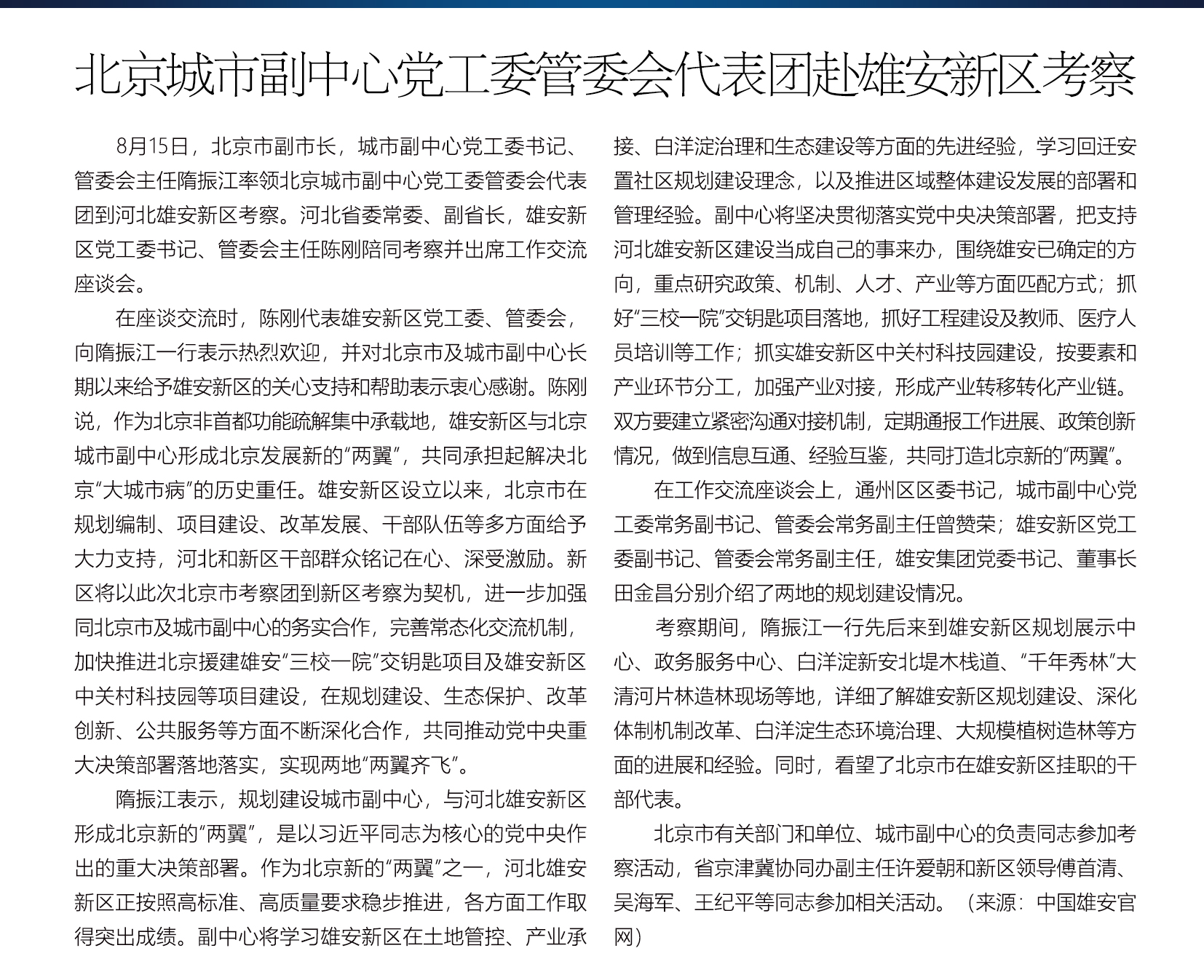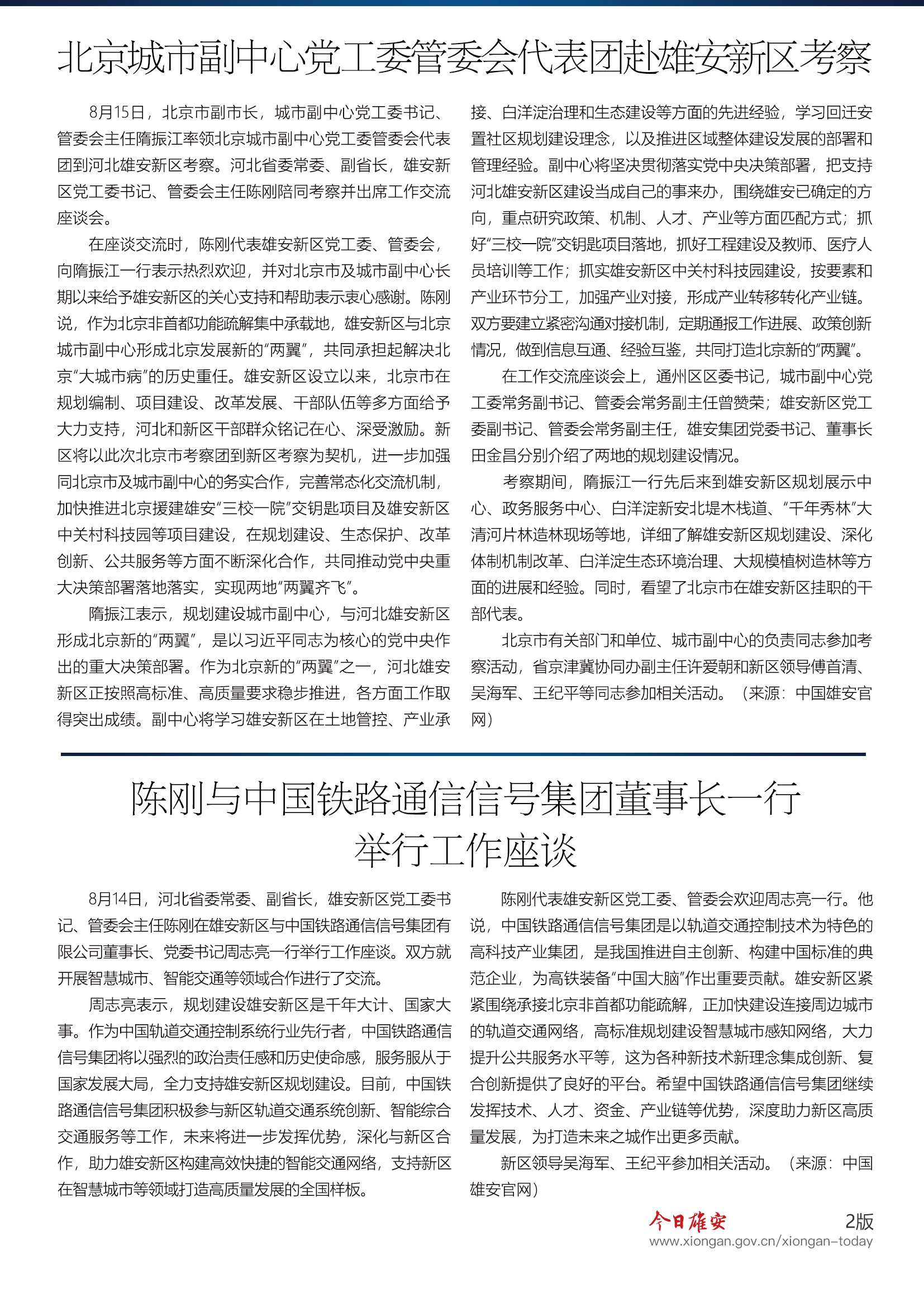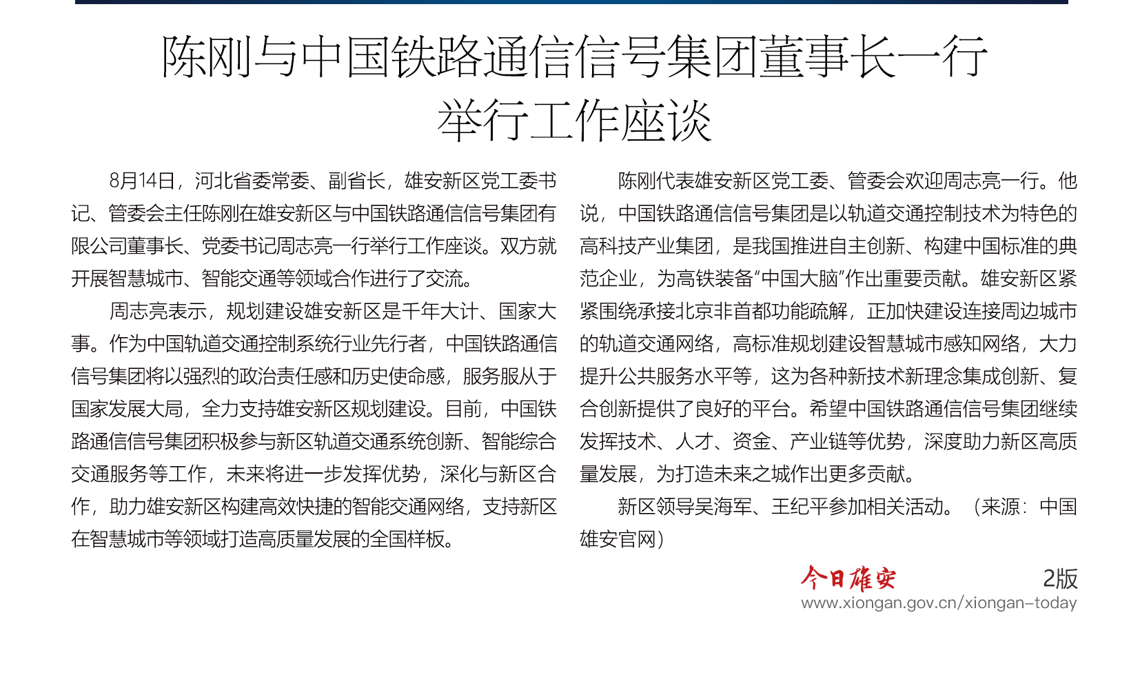 8月14日,河北省委常委、副省长,雄安新区党工委书记、管委会主任陈刚在雄安新区与中国铁路通信信号集团有限公司董事长、党委书记周志亮一行举行工作座谈。