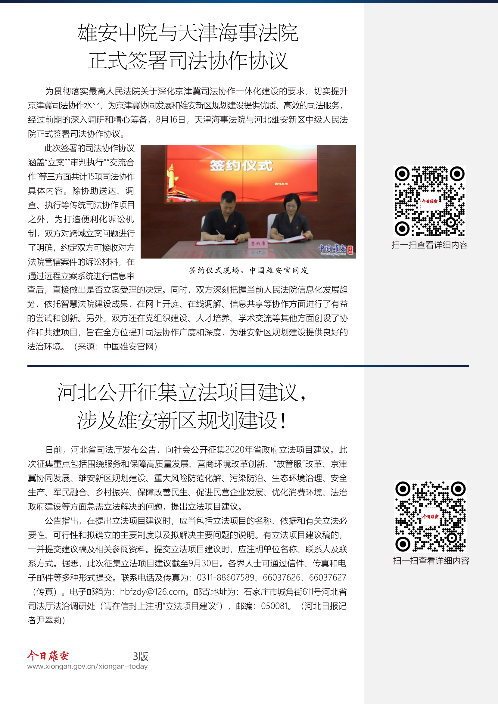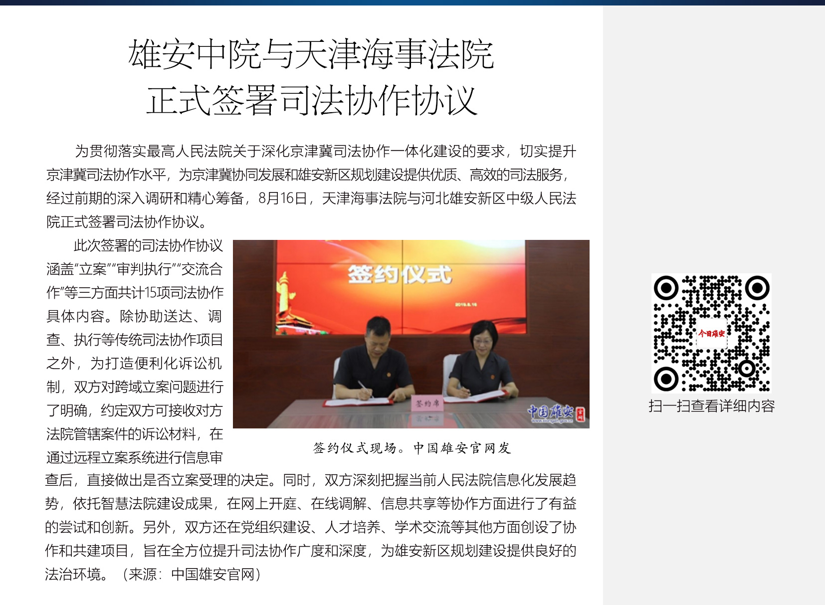 8月16日,天津海事法院与河北雄安新区中级人民法院正式签署司法协作协议。