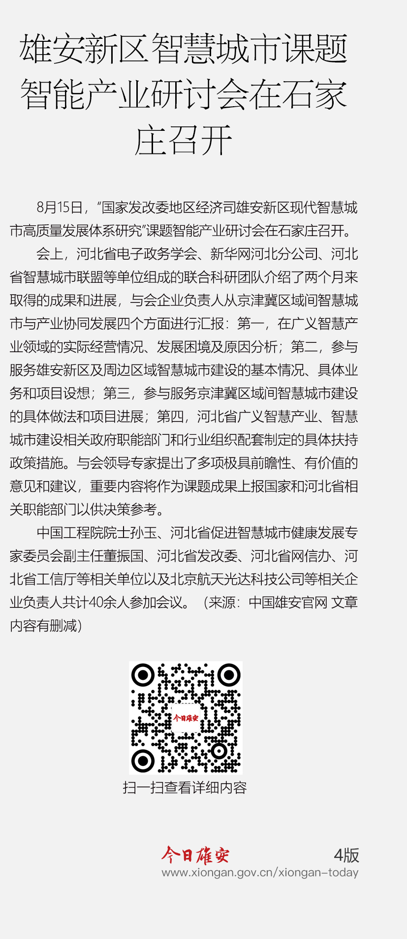 8月15日,“国家发改委地区经济司雄安新区现代智慧城市高质量发展体系研究”课题智能产业研讨会在石家庄召开。