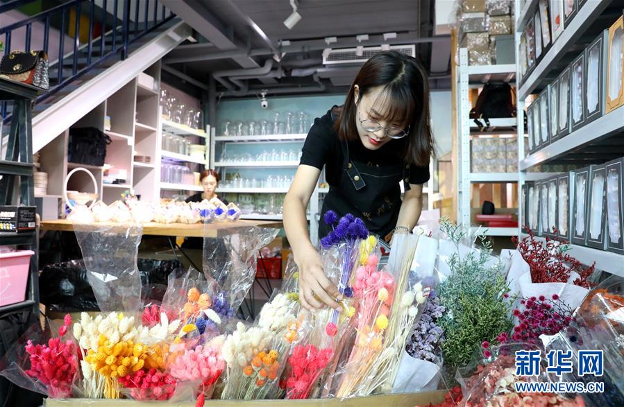8月19日,在石家庄市“那些花儿”创意工作室,工作人员在整理“永生花”花束。新华社记者 赵丹惠 摄