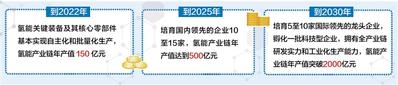 产业规模显著提升。到2022年,氢能关键装备及其核心零部件基本实现自主化和批量化生产,氢能产业链年产值150亿元。到2025年,培育国内领先的企业10至15家,氢能产业链年产值达到500亿元。到2030年,培育5至10家国际领先的龙头企业,孵化一批科技型企业,拥有全产业链研发实力和工业化生产能力,氢能产业链年产值突破2000亿元。