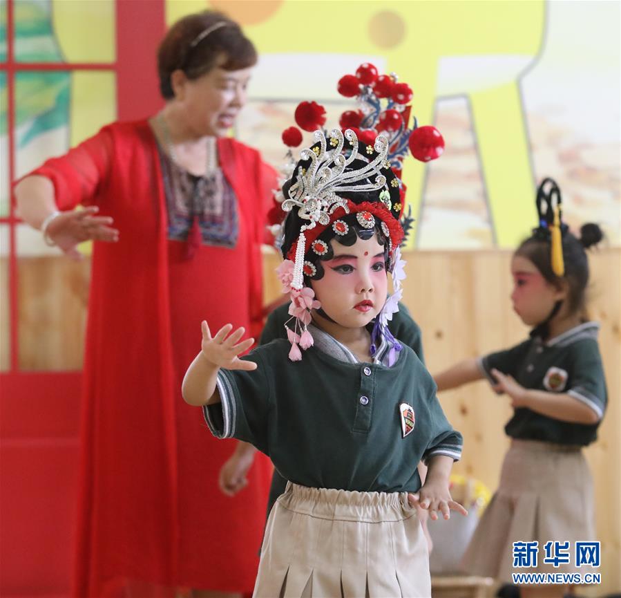 8月20日,在石家庄市井陉县亲亲宝贝幼儿园,孩子们在微水丝弦艺人的指导下学习戏曲动作。 微水丝弦属于河北石家庄地方戏曲,是河北省级非物质文化遗产项目,唱腔优美,戏装华丽,在当地深受百姓喜爱。近日,井陉县微水丝弦的艺人们走进当地幼儿园,向孩子们展示丝弦艺术,介绍戏曲基本知识,将民间艺术融入孩子们的心间。新华社记者 赵丹惠 摄