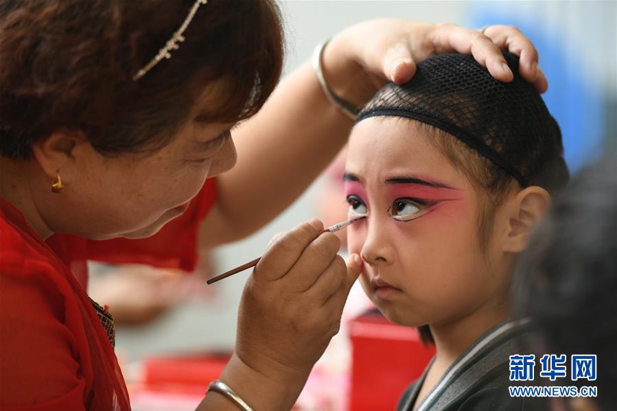 8月20日,在石家庄市井陉县亲亲宝贝幼儿园,微水丝弦艺人(左)在给小朋友化装。 微水丝弦属于河北石家庄地方戏曲,是河北省级非物质文化遗产项目,唱腔优美,戏装华丽,在当地深受百姓喜爱。近日,井陉县微水丝弦的艺人们走进当地幼儿园,向孩子们展示丝弦艺术,介绍戏曲基本知识,将民间艺术融入孩子们的心间。新华社记者 赵丹惠 摄