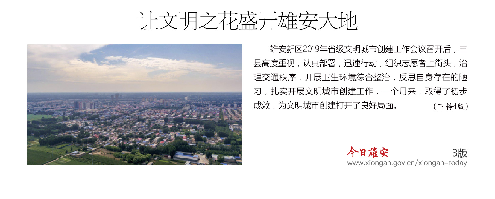 雄安新区2019年省级文明城市创建工作会议召开后,三县认真部署,迅速行动,扎实开展文明城市创建工作,一个月来,取得了初步成效,为文明城市创建打开了良好局面。