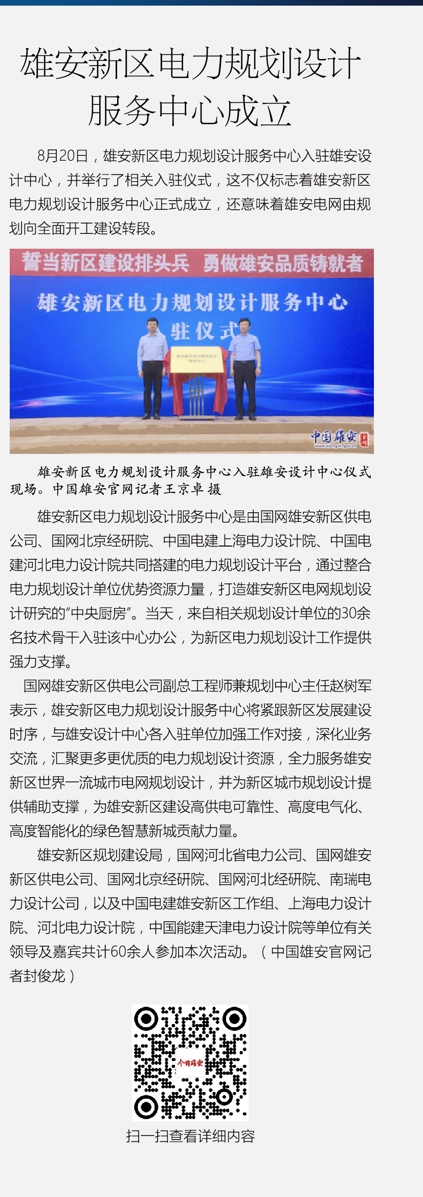 8月20日,雄安新区电力规划设计服务中心入驻雄安设计中心,并举行了相关入驻仪式。